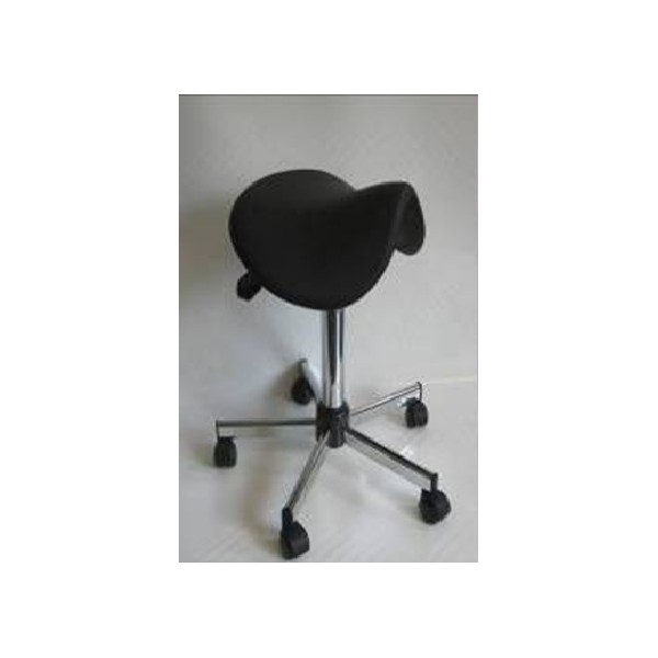 Siège à selle en polyuréthane et à piètement en acier chromé. Hauteur 410 à 540 mm.
