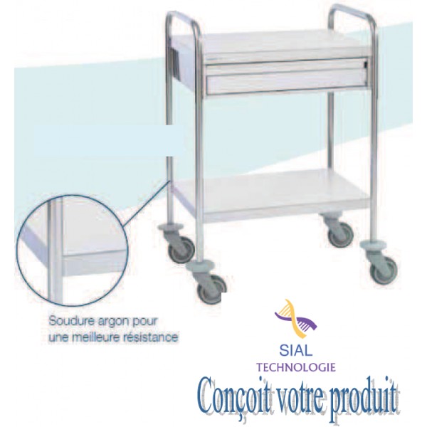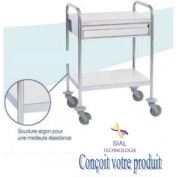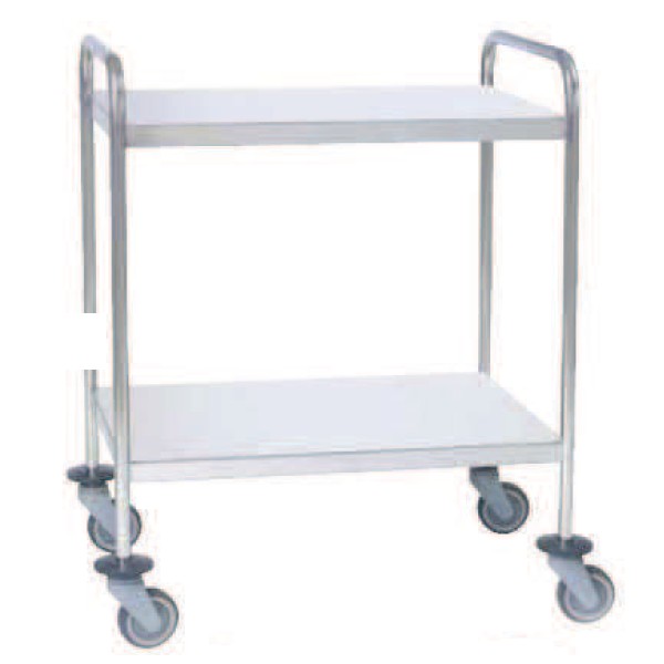 Guéridon de soins 2 plateaux, en inox à bords tombés et avec poignées. Dimensions 900x600 mm.