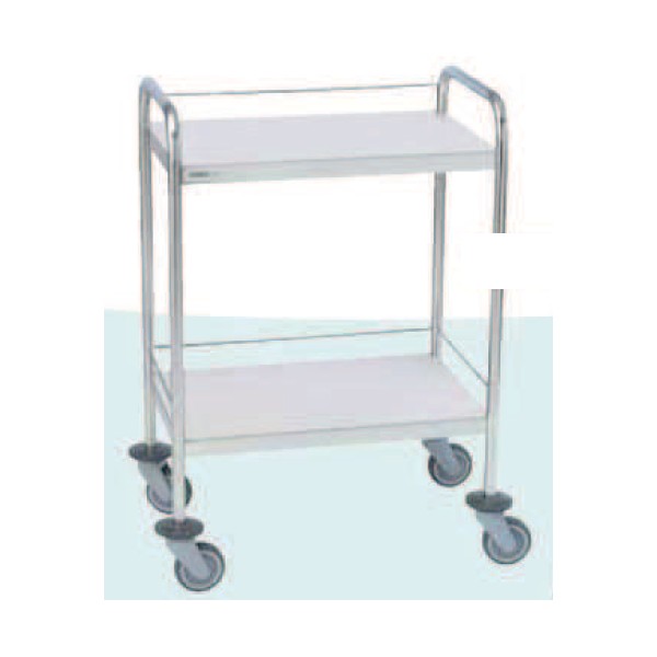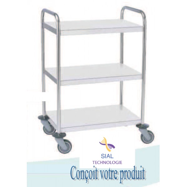 Guéridon de soins 3 plateaux, en inox, à bords tombés et avec poignées. Dimensions 900x600 mm.