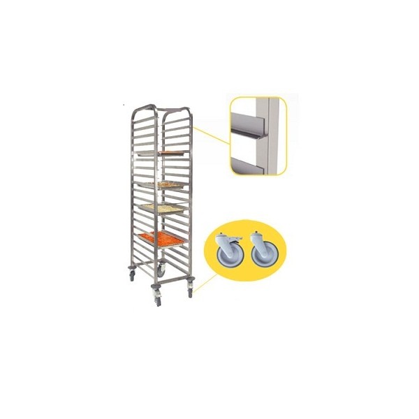Glissières en inox 18.10 (AISI 304), épaisseur 15/10 mm, avec butées avant et arrière, assemblées par un cordon de soudure assurant une haute résistance.