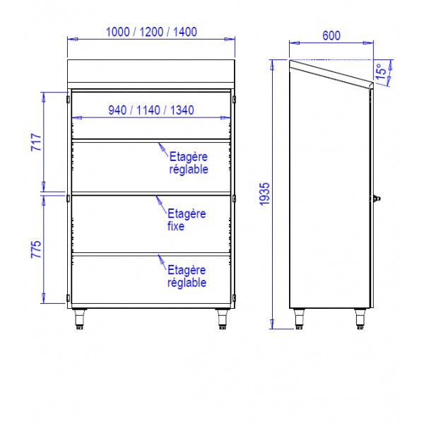 3 étagères (largeur 535 mm) dont 2 réglables en hauteur.