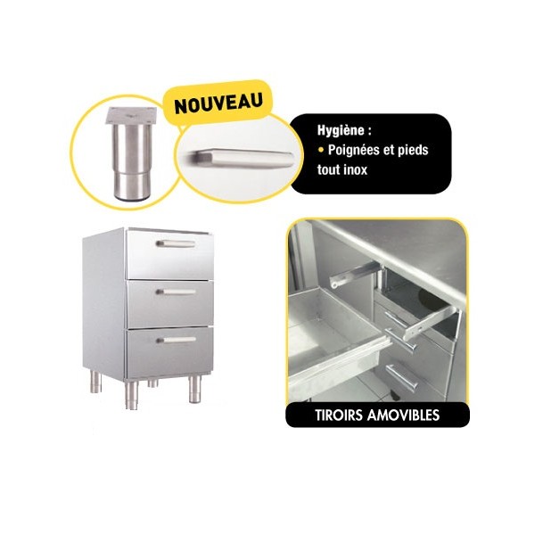 Meuble bas fixe en inox, Ã 3 tiroirs, sans dessus. Longueur : 450 mm.
