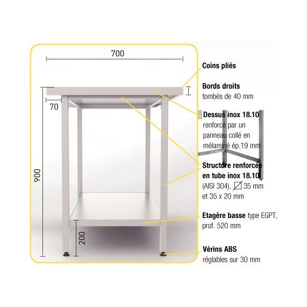 Tiroir inox pour table fixe. Largeur : 700 mm.