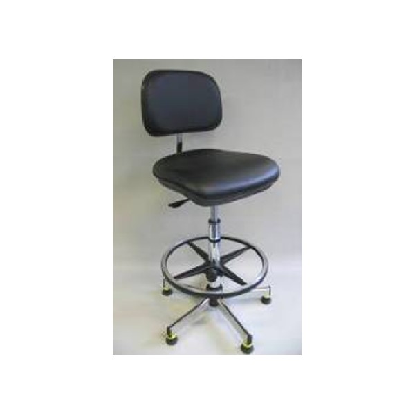 Siège de laboratoire à assise en vinyle antistatique et à piètement en acier chromé. Hauteur 440 à 570 mm.