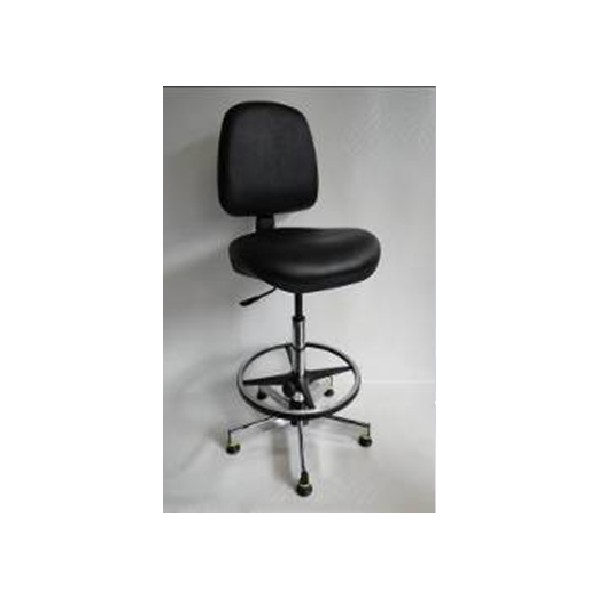 Siège de laboratoire à assise en vinyle antistatique et à piètement en acier chromé. Hauteur 420 à 550 mm.