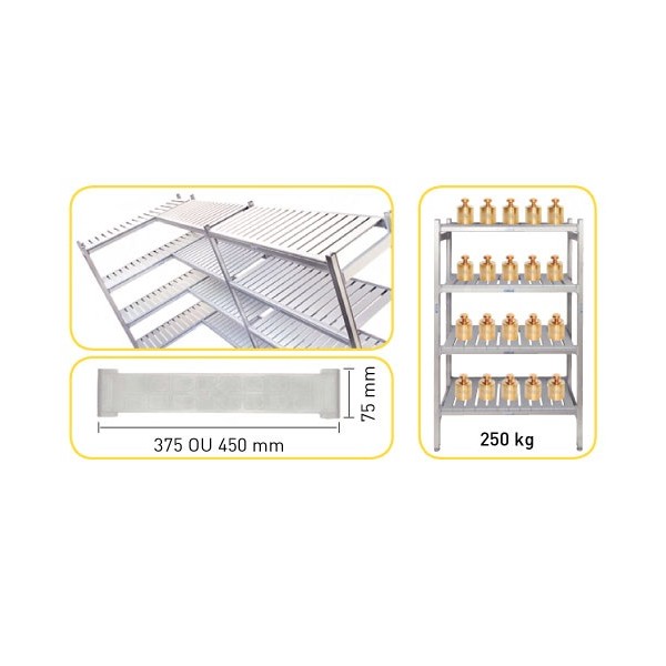 Etagère complète, à 3 niveaux, en aluminium. H=1700 mm, P=450 mm, L=5240 mm
